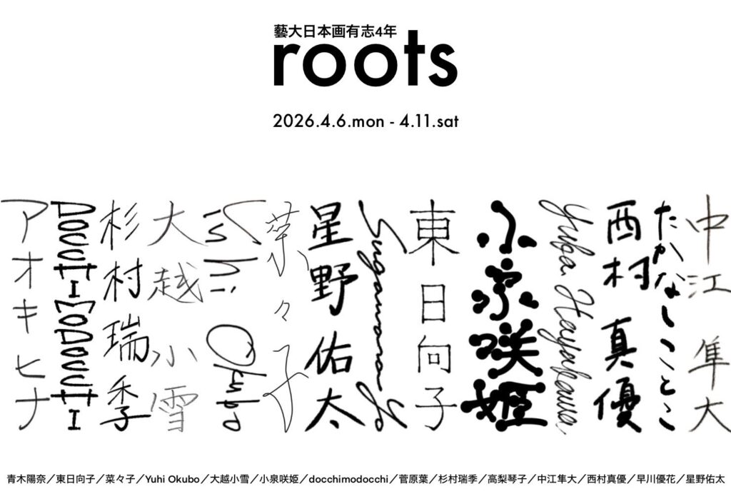 roots 2026年4月6日 - 2026年4月11日 藝大日本画有志4年 青木陽奈/東日向子/菜々子/Yuhi Okubo/大越小雪/小泉咲姫/doccimodocchi/菅原葉/杉村瑞季/高梨琴子/中江隼大/西村真優/早川優花/星野佑太